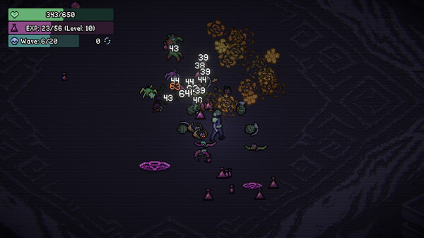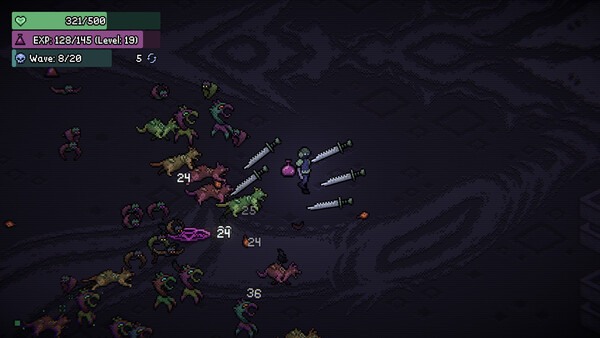 Enter a dark arena where everything is out to kill you. The action ensues in top-down retro pixel art style where you control a lone human combatant, strategically navigating in every direction and around columns to keep incoming enemy hordes at a safe distance, but still within striking range. Start by selecting a single weapon, then pick up experience drops to level up and improve gear or choose additional armaments. Collect hearts to recover health, gain temporary speed boosts and more! How long can you hang on?